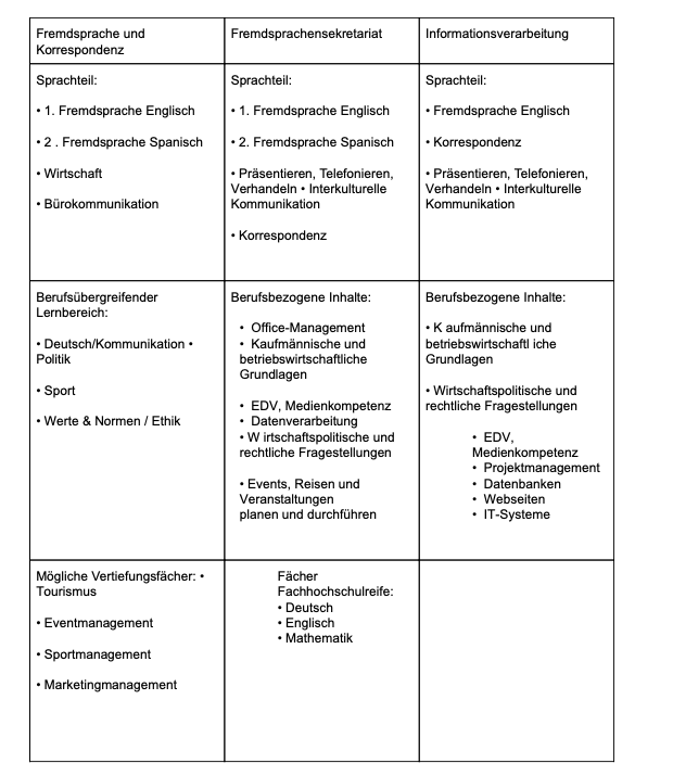 Wer parallel noch die Fachhochschulreife mit absolvieren will, muss zusätzlich Kurse in Deutsch, Englisch und Mathematik besuchen. Was sagen uns die drei Schwerpunkte? Fremdsprachen und Korrespondenz eignet sich, wer den Fokus stärker auf Sprachen lenken möchte. Der Schwerpunkt Fremdsprachensekretariat bereitet am besten auf eine Tätigkeit im Bereich Office Management oder in einem Partnersekretariat vor. Der Schwerpunkt Informationsverarbeitung bietet sich für technikaffine Azubis an.